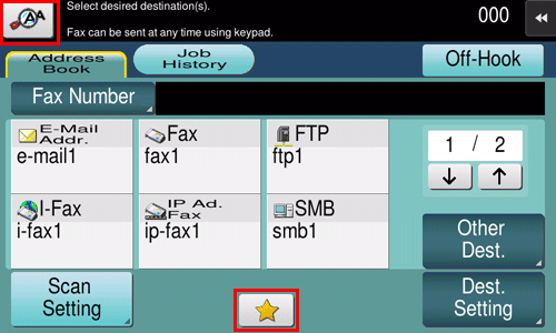 [Fax] | Displays the main screen in fax mode. The fax mode only provides fax functions of the functions that are available in the scan/fax mode. This mode enables you to quickly recall the target function when using a fax. The fax mode has the following features.