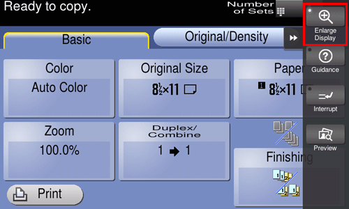 This function configures a screen layout focused on commonly used functions, enabling a user who has difficulty viewing the normal screen to easily perform operations. To return to the normal screen, tap [Enlarge Display] again.