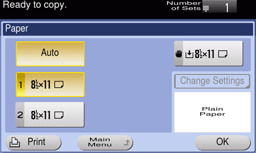 Paper Tray | Specifies the paper loaded in the paper tray when making a copy. The displayed contents vary depending on the options installed on this machine. |