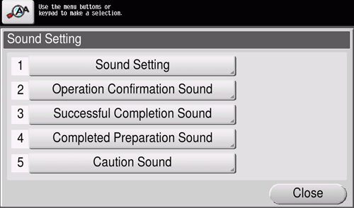 [Sound Setting] | Select whether to respectively output the [Confirmation Sound], [Successful Completion Sound], [Completed Preparation Sound], [Caution Sound], [Deletion Sound], and [Authentication Sound] (default: [On]). If [All Sounds] is set to [Off], none of these sounds will be output. |