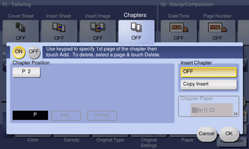 • [Copy Insert]: Copy the first page of the chapter on the different type of paper form text pages. Select the paper tray loaded with paper to be inserted in [Chapter Paper].