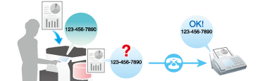 The Check Dest. and Send function checks the fax number specified for the fax transmission against the destination fax number (CSI) and sends the fax only when they match.