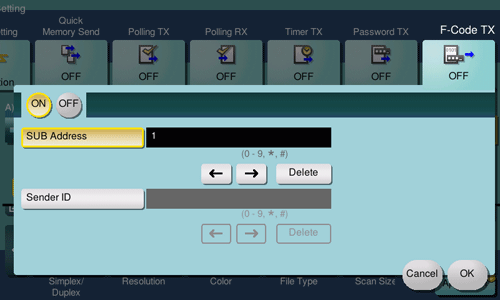 Tap [Application] - [Fax Setting] - [F-Code TX], and tap [ON].