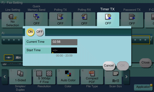 Tap [Application] - [Fax Setting] - [Timer TX], and tap [ON].