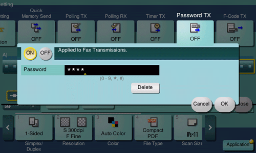 Tap [Application] - [Fax Setting] - [Password TX], and tap [ON].