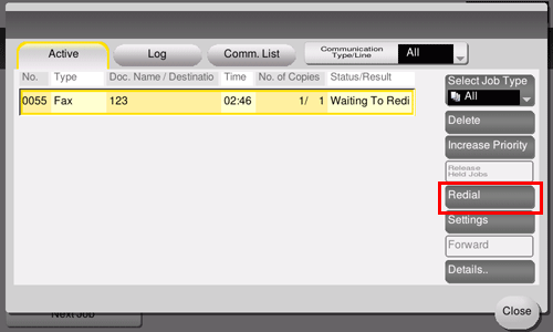 Select a job you wish to resend, and also tap [Redial].