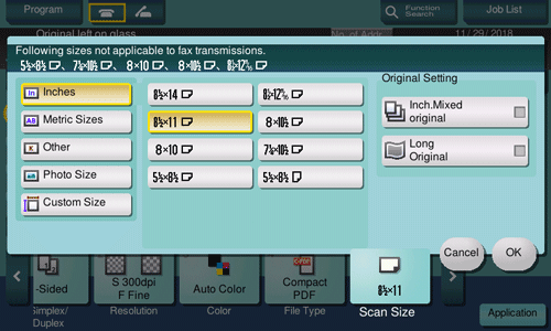 [Inch.Mixed original] | Select this option to scan an inch-size original of the same width using the ADF. This function is available only for the following original sizes. |