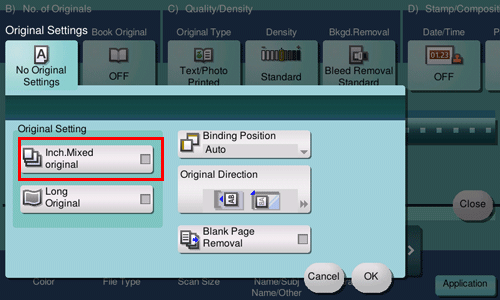[Inches] | Select this option to scan an inch-size original. Tap [Inches], and also select a standard inch size. |