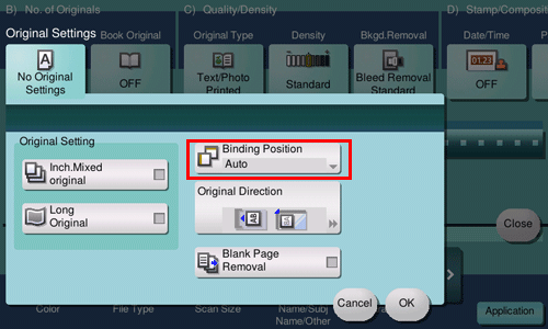 [Auto] | Automatically configures the binding position of the original. When the long side of the original is 11-11/16 inches (297 mm) or less, the binding position is set to the long side of the paper. When the long side of the original exceeds 11-11/16 inches (297 mm), the binding position is set to the short side of the paper. |