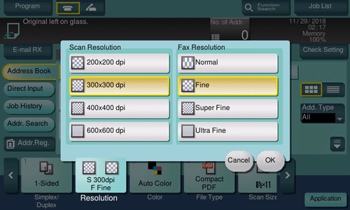 The finer the scan resolution is, the larger the data volume becomes, resulting in longer transmission time. To use an E-mail as a transmission method such as Scan to E-mail or Internet fax transmission, check that the data capacity are not limited.