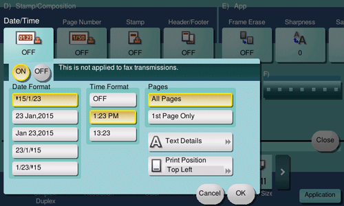 Add the date, time, and any desired text in the top and bottom margins (header/footer) of the specified page. You must register the information to be added for the header and footer in advance on this machine.