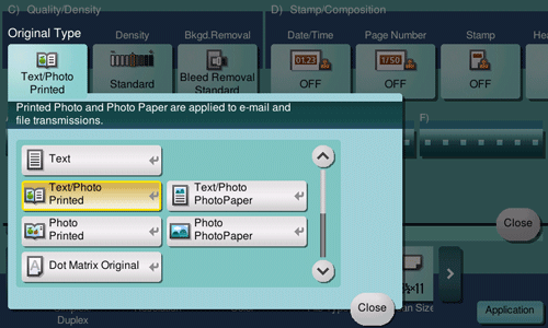 [Text/Photo PhotoPaper] | Scans an original consisting primarily of text and photos at the optimum image quality level. This function sharpens the edges of each character and reproduces smoother photos. Select this option to scan originals that include photos printed on photographic paper. |