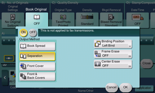 [ON]/[OFF] | Select [ON] to specify Book Original. |