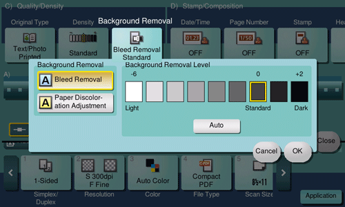 [Background Removal Level] | Adjusts the density of the background color for an original with a colored background. Selecting [Auto] automatically determines the density of the background color, and scans an original at the optimum background density level. |