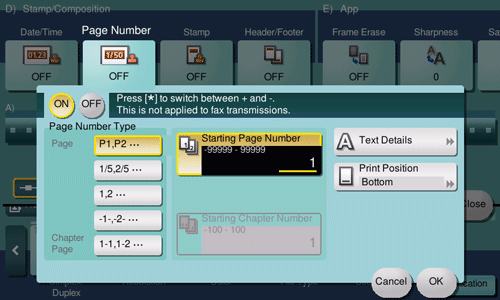 [Starting Chapter Number] | Specify the starting chapter number if a file is divided into chapters, and you want to print chapter numbers from the second chapter. You can specify starting chapter numbers when you have selected [Chapter Page] in [Page Number Type]. For example, to print chapter numbers from the third chapter, enter "-1". The first chapter of the file is counted as "-1", the second chapter as "0", and the third chapter is counted as "1". In [Starting Chapter Number], a chapter number is printed on the chapters that are count as 1 and later. If "2" is entered, a number is printed from the first page of the first chapter of the file as "2-1, 2-2". "-" (minus sign) switches "+" and "-" each time you tap [*]. |