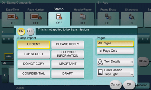 A text such as "PLEASE REPLY" or "DO NOT COPY" is printed on the first page or all pages. You can select the text to be added from the registered fix stamps and arbitrary registered stamps.