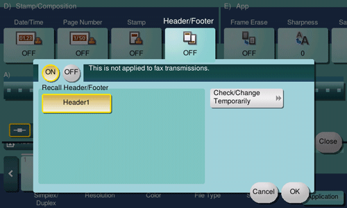 [Check/Change Temporarily] | If necessary, check or temporarily change the details of the program that is selected in [Recall Header/Footer].