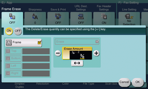 [Top]/[Bottom]/[Left]/[Right] | Specify a different width for each side of the original to erase the side. Cancel the [Frame] setting, select the side to erase the frame, and specify the width to erase in [Erase Amount]. If you do not want to erase the side, cancel the setting for [Erase]. |