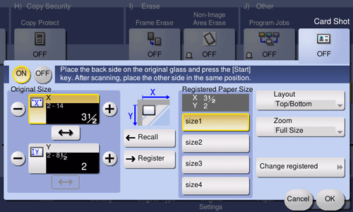 [Original Size] | Specify the size of a card to be copied. From the [Registered Paper Size], you can recall a size previously stored and specify the size. After you have entered the size, select a key in [Registered Paper Size], and tap [Register]. Then the size you have entered is registered in the memory. You can recall the registered size at a later date. |