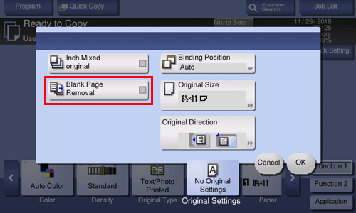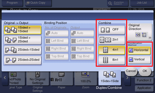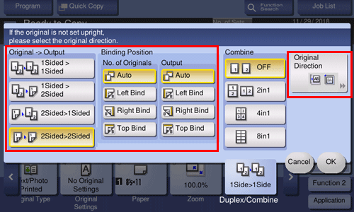 [Original > Output] | Select a combination of the original to be loaded (1-sided original or 2-sided original) and the copy method (1-sided copy or 2-sided copy). If you have selected other than [1Sided > 1Sided], also specify [Binding Position] and [Original Direction]. | |