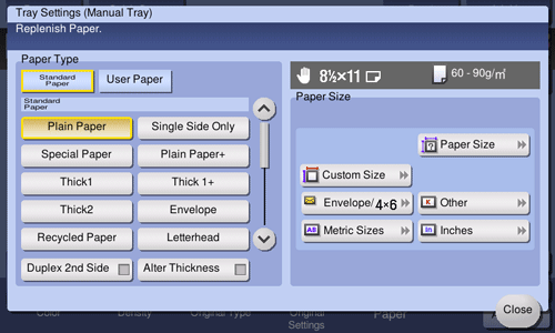 [Paper Type] | Select the type of the paper loaded in the selected paper tray. For details on the available paper types, refer to Here. When you are using plain paper of 15-15/16 lb to 18-5/8 lb (60 g/m2 to 70 g/m2), tap [Alter Thickness]. The paper tray with [Alter Thickness] selected is set to a lower priority level than the paper trays in which plain paper is loaded. However, if [Alter Thickness] is selected for all paper trays, the appropriate paper tray is selected based on the priority sequence specified in [Auto Paper Tray Selection Setting] (Here). |