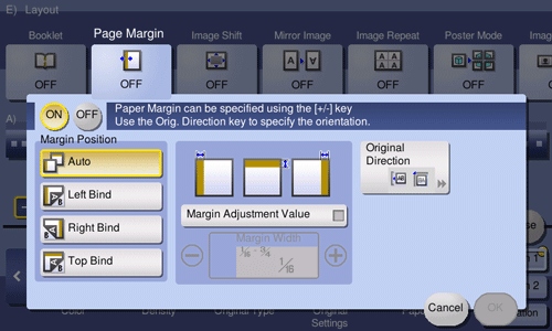 [ON]/[OFF] | Select [ON] to specify Binding Margin. |