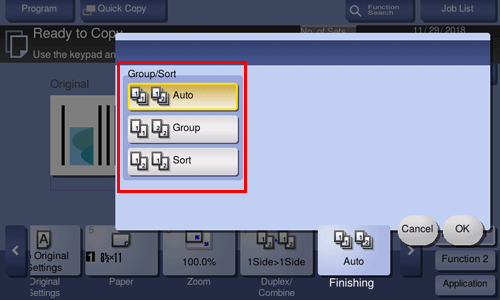 [Auto] | Automatically switches between Sort and Group according to the number of printed sheets for each set, and feeds out. If the number of printed sheets for each set is 1, the Group function is applied. If the number is 2 or larger, the Sort function is applied. |