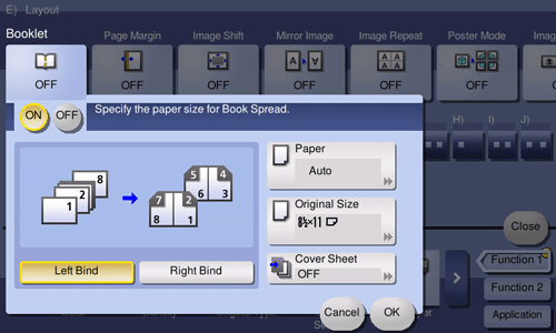 Sorts original data pages like a booklet and copies on both sides in spread. You can also specify the binding position, or insert front and back covers.