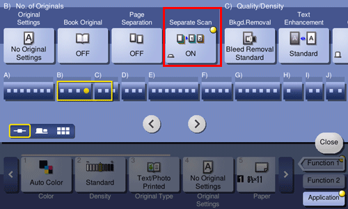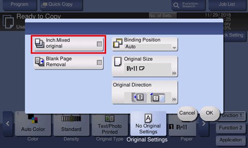 Scans each loaded original with different settings, and makes copies collectively. Use this function when various types of originals are mixed, such as 1-sided original to be printed on one side of paper, and 2-sided original to be copied by enlarging.