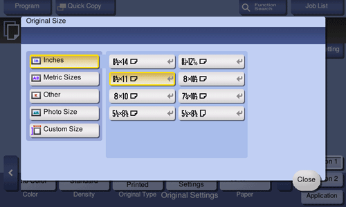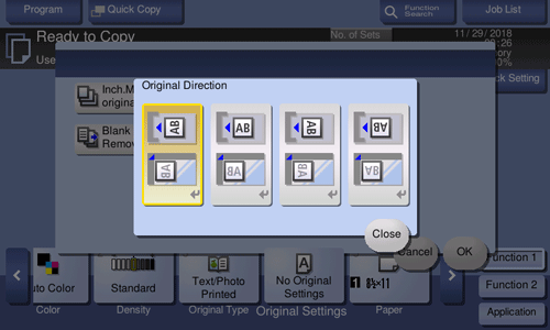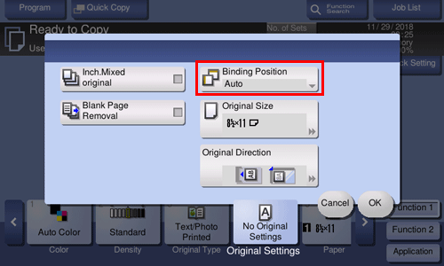 [Auto] | Automatically configures the binding position of the original. When the long side of the original is 11-11/16 inches (297 mm) or less, the binding position is set to the long side of the paper. When the long side of the original exceeds 11-11/16 inches (297 mm), the binding position is set to the short side of the paper. |