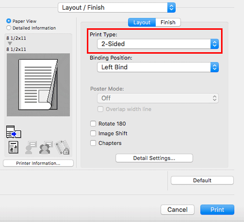 In [Print Type:] in [Layout / Finish], select [2-Sided]. [2-Sided] is specified by default.