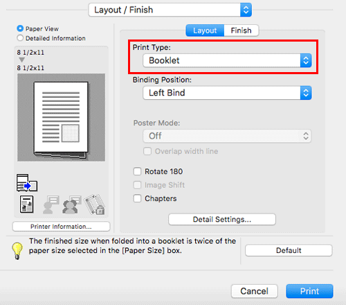In [Print Type:] in [Layout / Finish], select [Booklet].