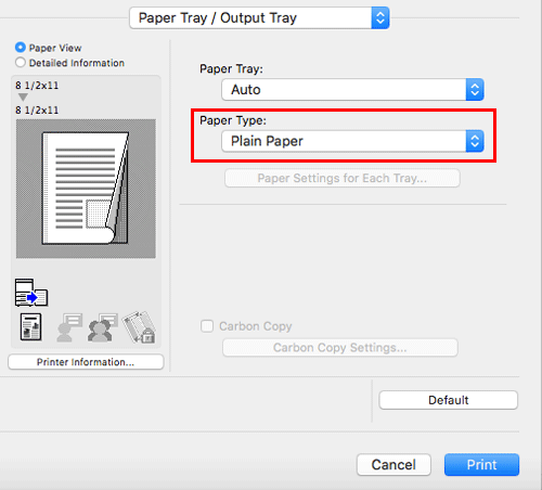 In [Paper Type:] in [Paper Tray / Output Tray], select the type of paper for printing.