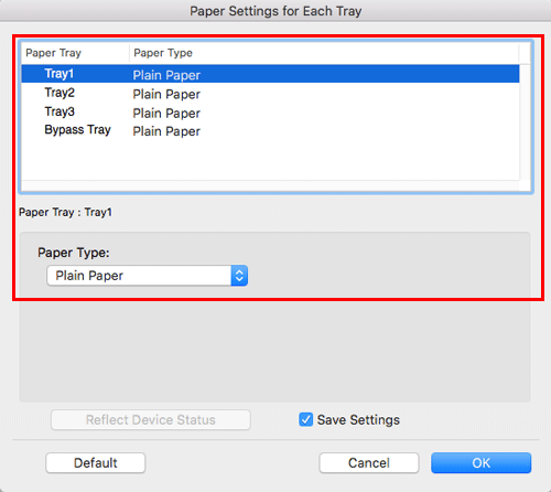 When [Paper Settings for Each Tray] is enabled in the [Installable Options] page of the printer driver, select [Paper Settings for Each Tray...] in [Paper Tray / Output Tray], and specify the paper type for each tray.