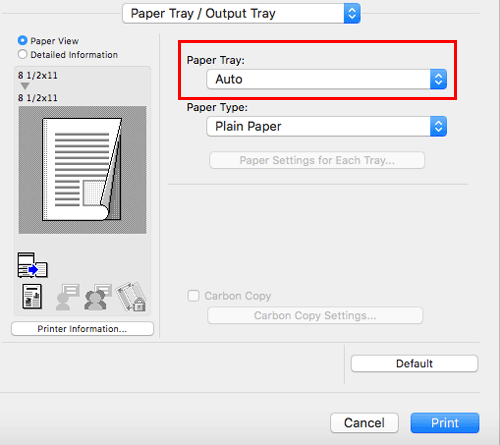 In [Paper Tray:] in [Paper Tray / Output Tray], select the paper tray for printing.