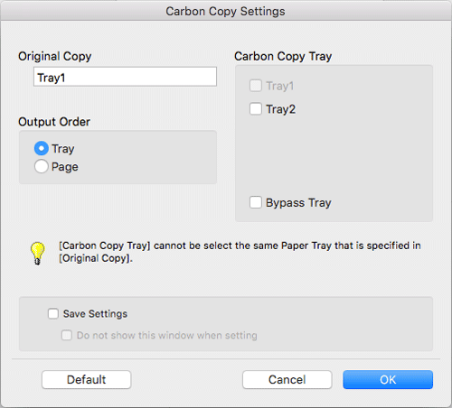 [Save Settings] | When the Save Setting check box is selected, the settings are saved. When the [Do not show this window when setting] check box is selected, this dialog box is not displayed when [Carbon Copy] is enabled. Using this function, you can save steps to configure settings the next time and after if you always specify the same carbon copy tray settings to execute a print job. |