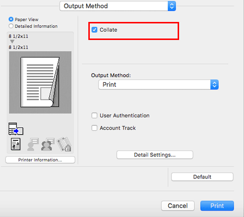 When the [Collate] check box in [Output Method] is selected, copies are output in a set-by-set manner, for example, "Pages 1, 2, 3, 4, and 5", "Pages 1, 2, 3, 4, and 5", and then "Pages 1, 2, 3, 4, and 5".