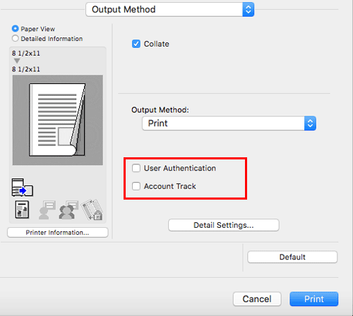 In the [Output Method] window, select the [User Authentication] check box (and the [Account Track] check box).