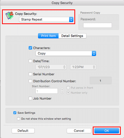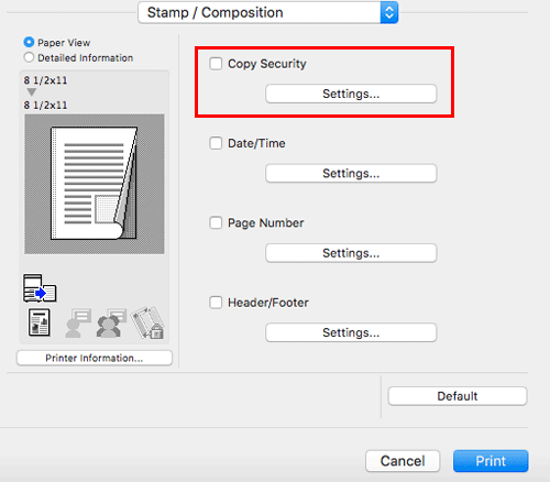 In [Stamp / Composition], select the [Copy Security] check box, then click [Settings...].