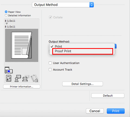 In [Output Method:] in the [Output Method] window, select [Proof Print].