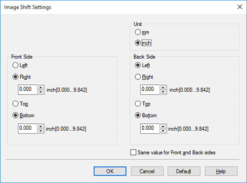 When printing images on both sides, selecting the [Same value for Front and Back sides] check box applies the same settings to both sides.