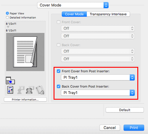 In [Cover Mode], select the [Front Cover from Post Inserter:] and [Back Cover from Post Inserter:] check boxes.