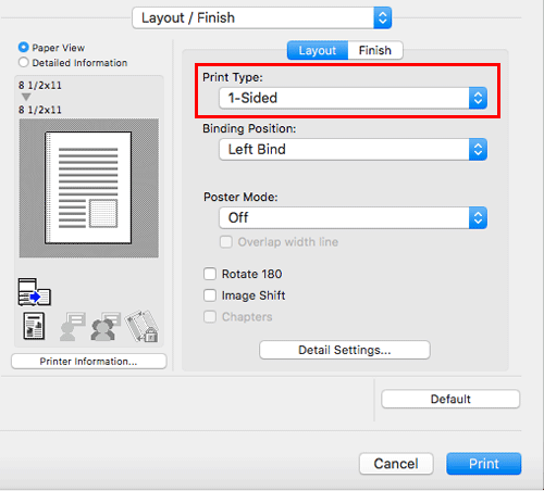 In [Print Type:] in [Layout / Finish], select [1-Sided].