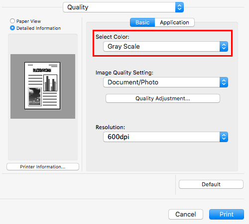 In [Select Color:] in [Quality], select [Gray Scale].