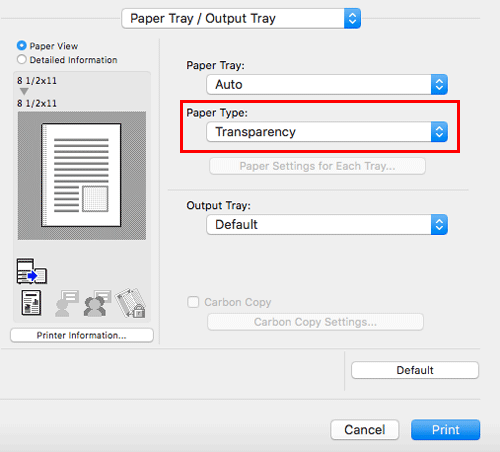 In [Paper Type:] in [Paper Tray / Output Tray], select [Transparency].