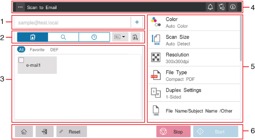 If you tap [Scan to Email] on the home screen, the main screen of Scan To E-mail is displayed.