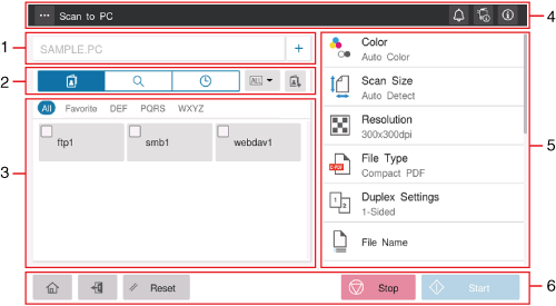 If you tap [Scan to PC] on the home screen, the main screen for PC sending (SMB/FTP/WebDAV) is displayed.