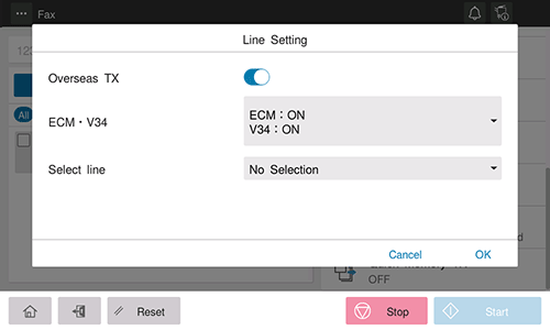 [Select line] | If multiple lines are used, select the line used to send a fax. In general use, use [Line 1]. If [Not selection] is selected, either line, whichever is not busy, is used for transmission. |