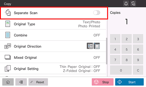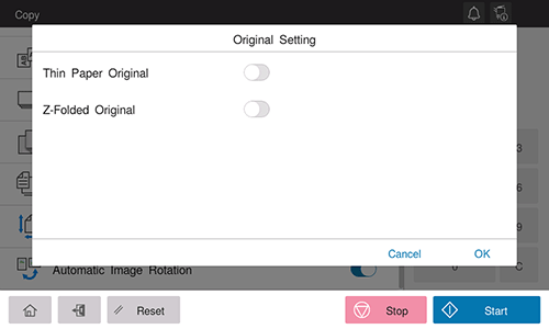 [Z-Folded Original] | If a folded original is loaded into the ADF, the original size may not be able be detected accurately. To scan the folded original on the ADF, set this option to ON. |