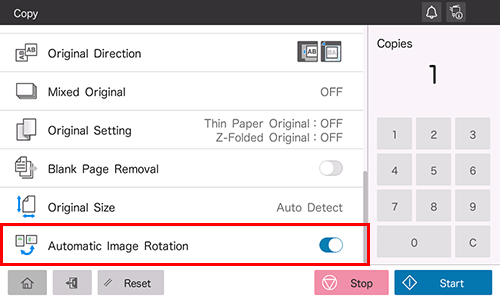 In general use, this machine automatically rotates the original image according to the paper direction to make a copy. Turning [Automatic Image Rotation] OFF as needed enables you to make a copy without rotating the original image. This function is available when you want to copy only a part of the original.